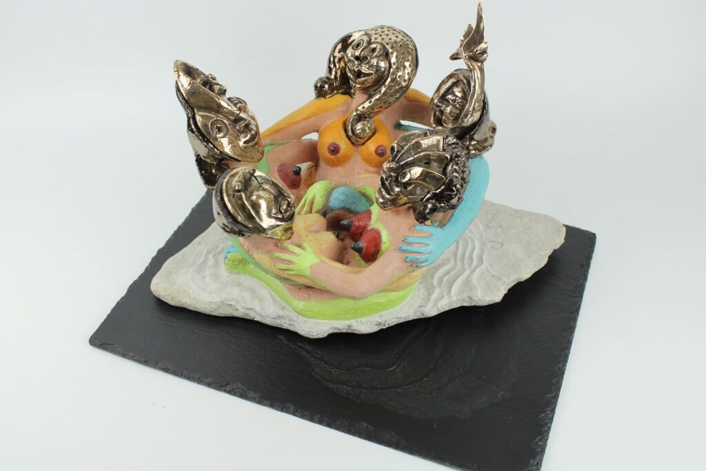 Chœur de femmes – Le bain Dans cette œuvre en céramique et bronze, cinq femmes nues, assises sur une pierre sculptée d’ondes et de vagues, forment un cercle en se tenant par les bras. Leurs corps entrelacés, sublimés par un travail en jus d’oxyde et pastel gras, semblent se dissoudre les uns dans les autres, […]